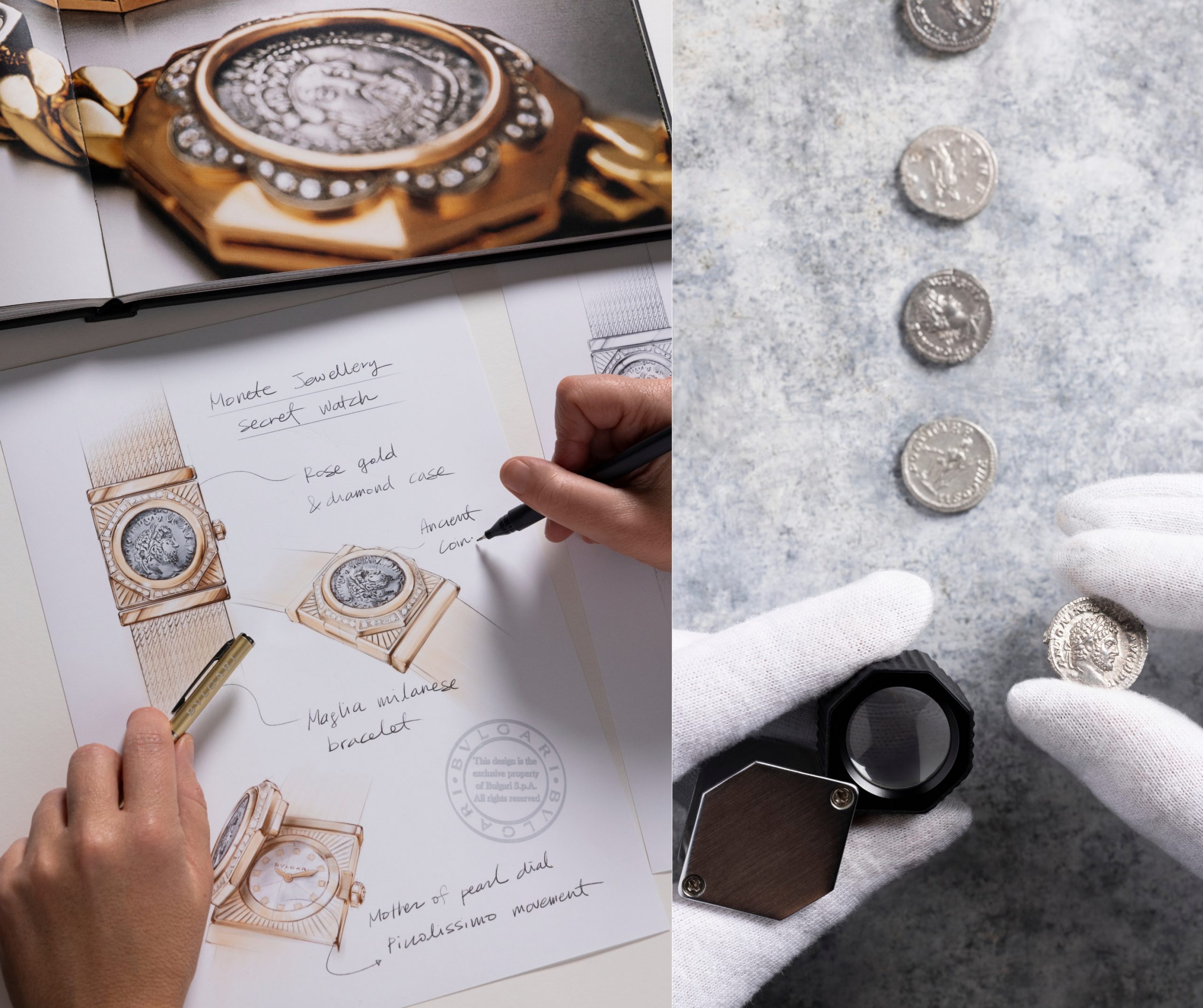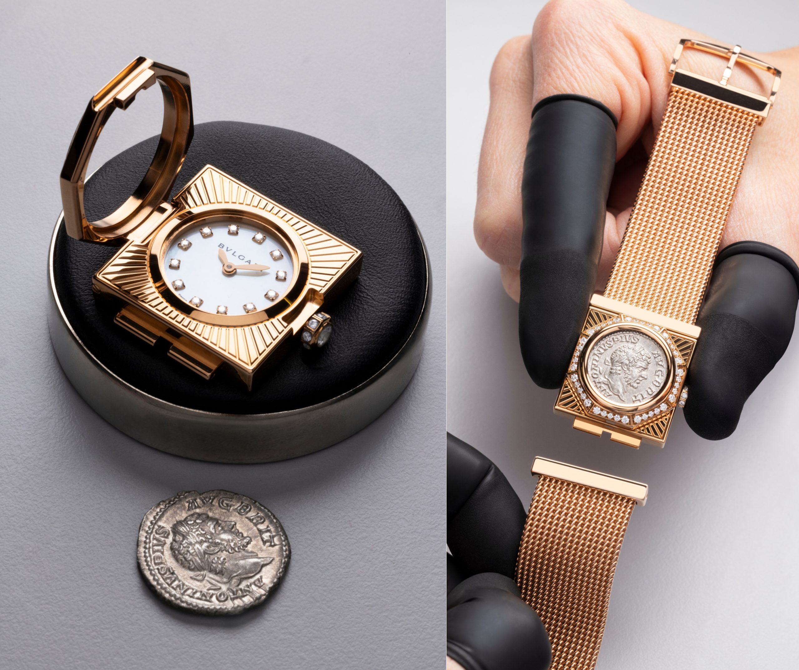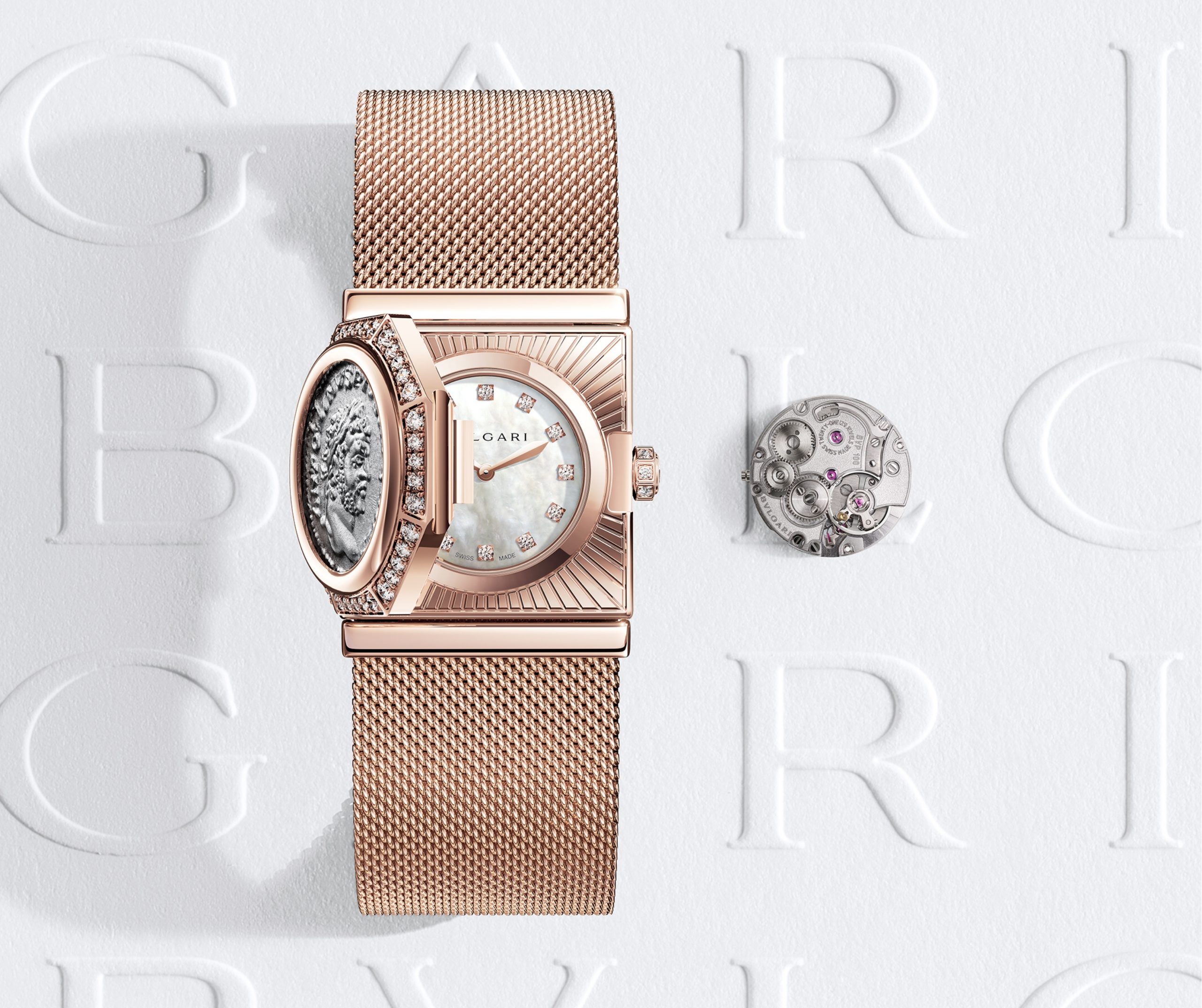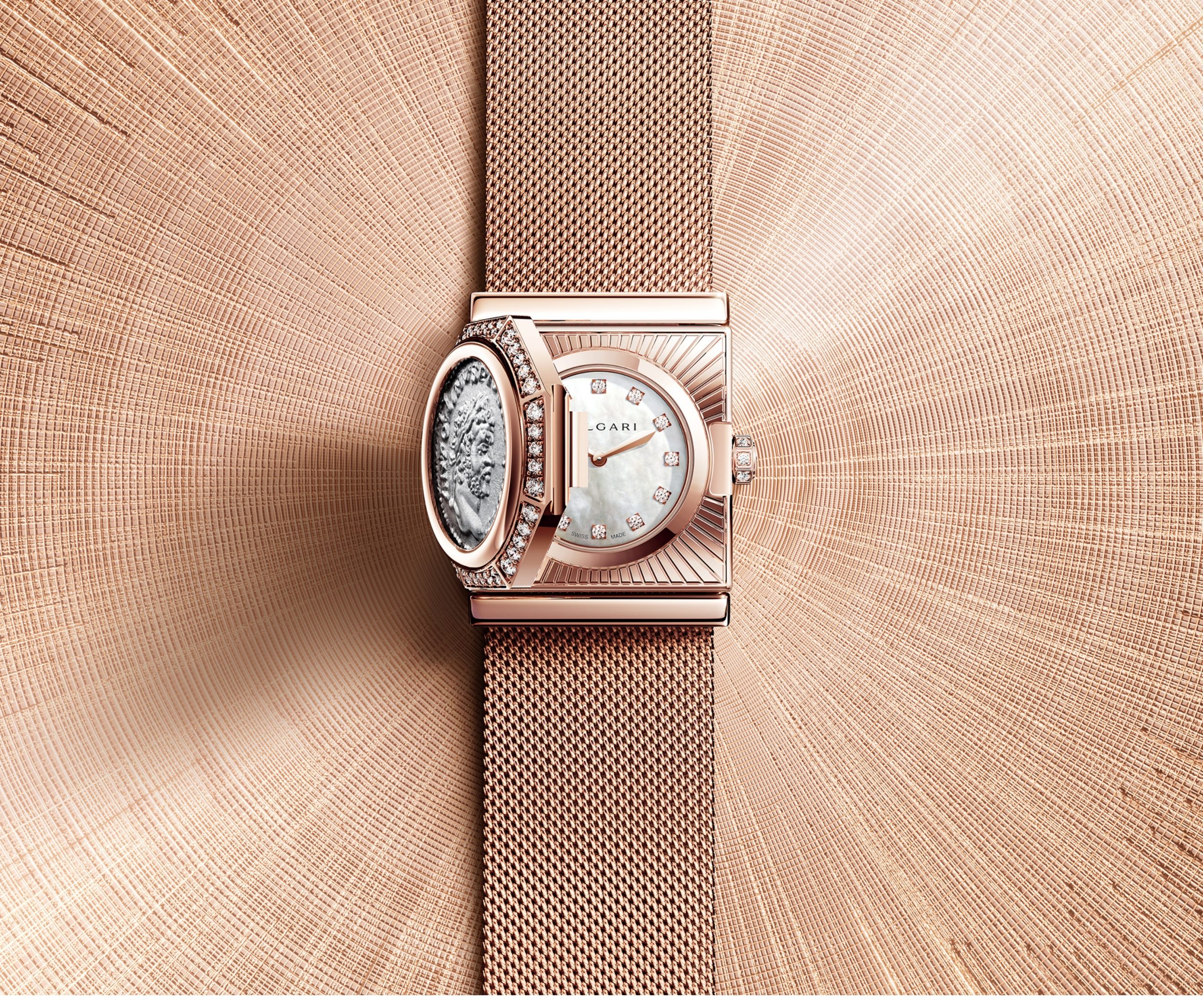 La moneda se integra en una caja de oro rosa engastada con diamantes, enmarcada por un octógono geométrico que dialoga con la tradición arquitectónica romana. A su alrededor, la malla milanesa, que está formada por hilos de oro entrelazados, aporta flexibilidad y textura, creando un contraste entre rigidez histórica y fluidez contemporánea.
