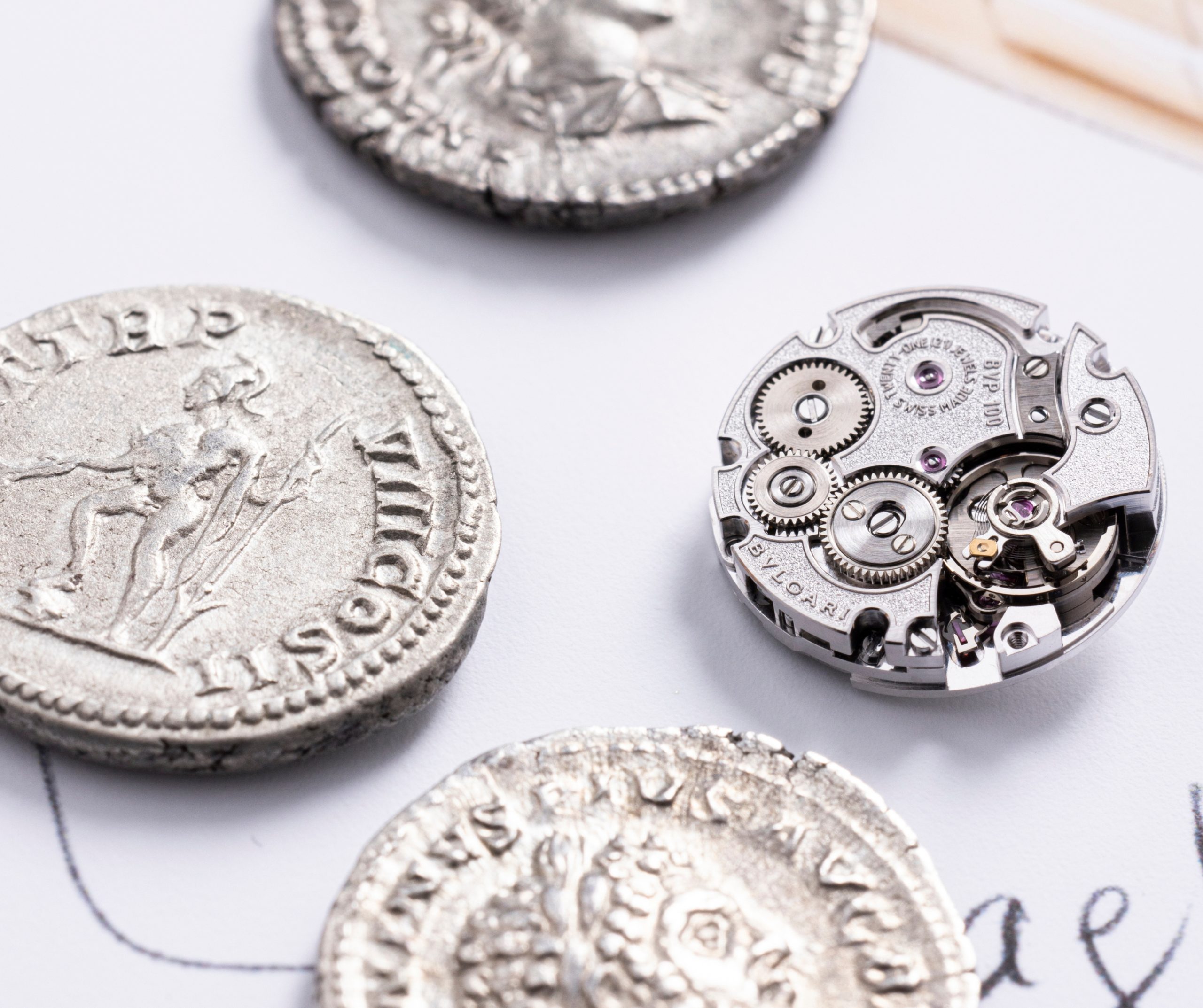 Diseñado y producido por Bvlgari en Le Sentier, el calibre Piccolissimo aparece aquí con cuerda por corona y fondo de zafiro, integrando la mecánica al diseño con total naturalidad. En el Maglia Milanese Monete, la malla flexible y el carácter de reloj secreto transforman la referencia histórica en una pieza cómoda y actual, pese a su referencia directa a la Antigüedad, donde el lujo se entiende como síntesis de tiempo, técnica y uso real.