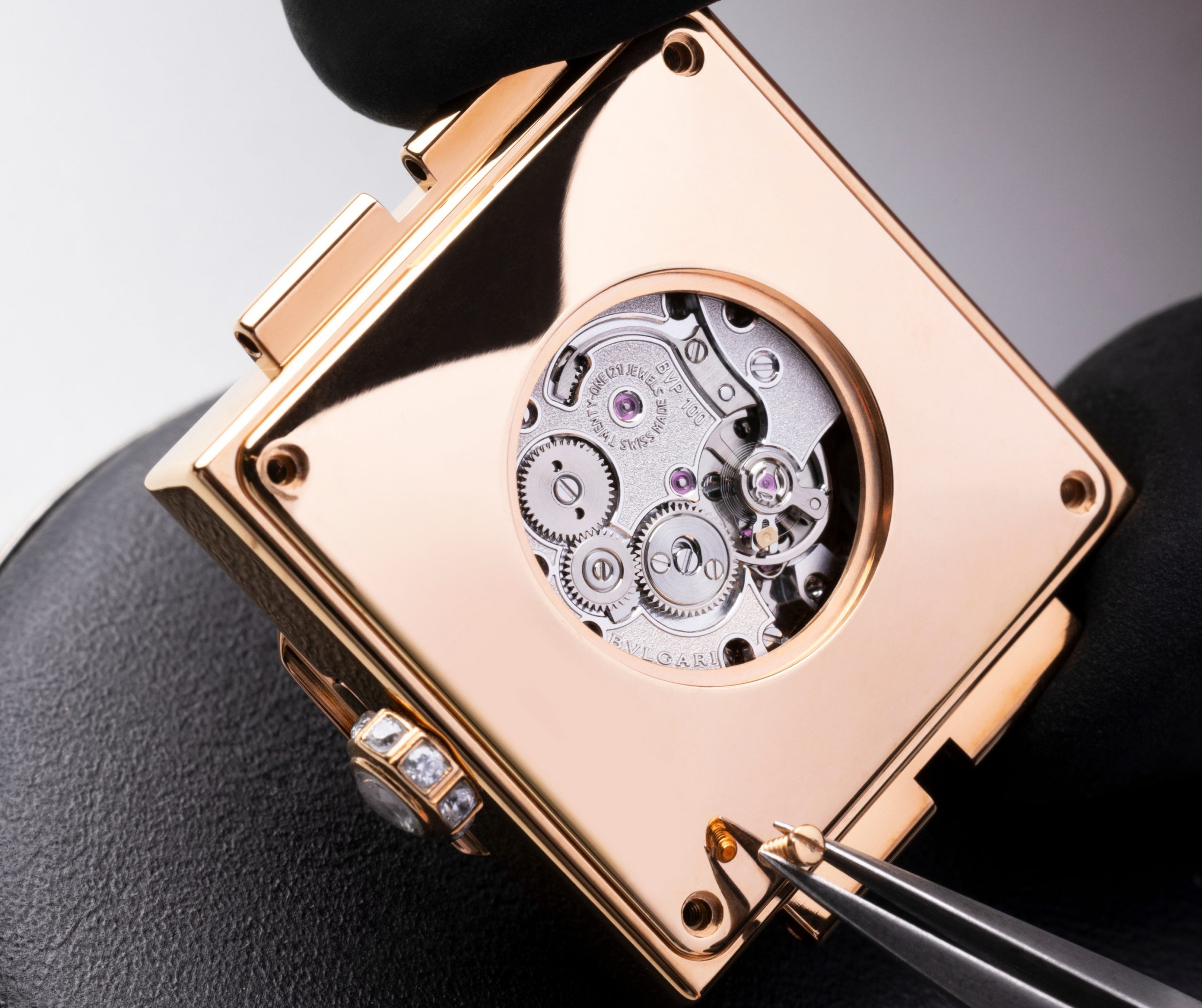 En el interior de esta pieza late el Piccolissimo BVP100, el calibre redondo más pequeño del mundo. Con un diámetro de 13.50 mm, un grosor de apenas 2.50 mm y un peso de 1.9 gramos, este micromovimiento mecánico manual integra 102 componentes y ofrece una reserva de marcha de 30 horas.