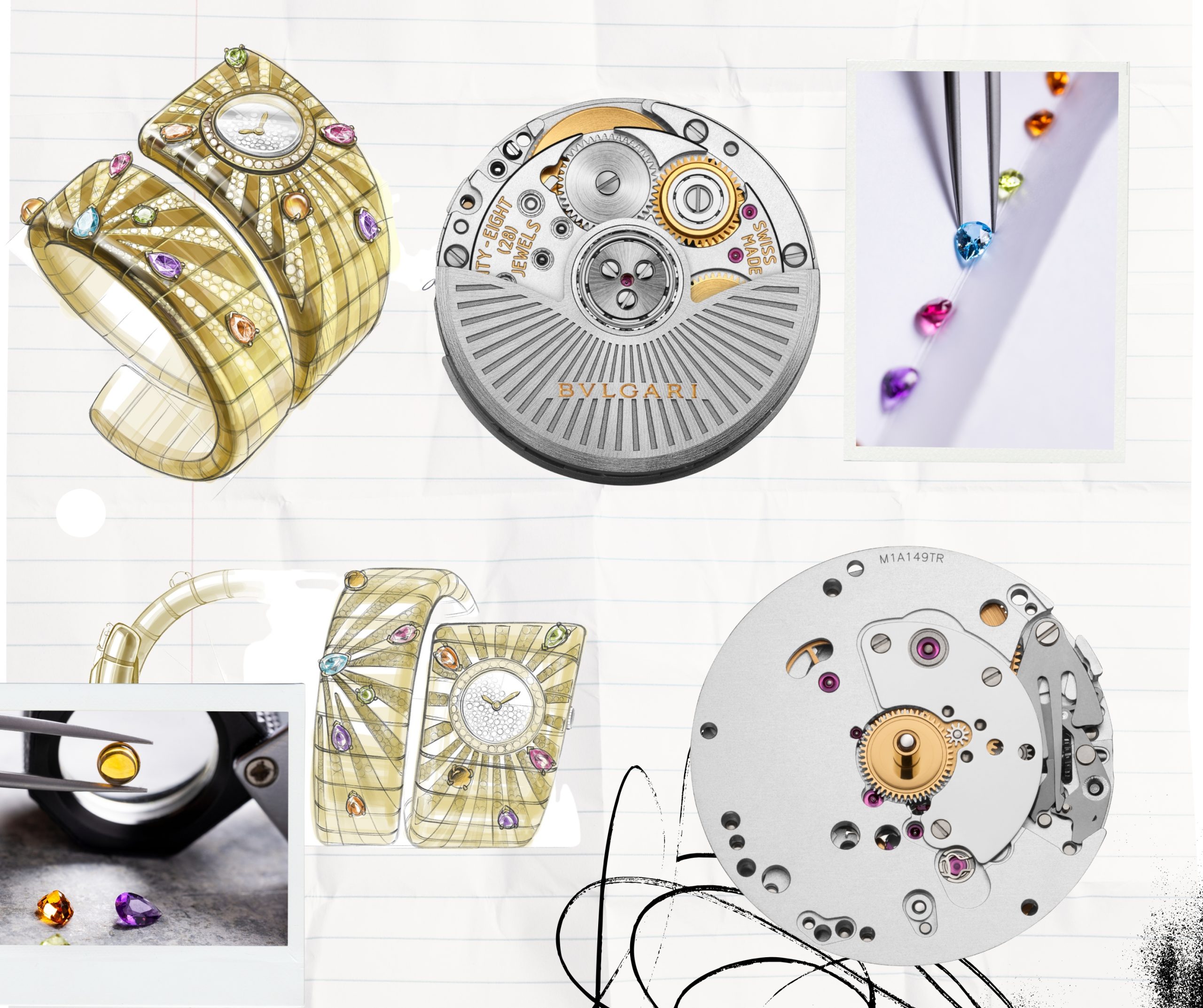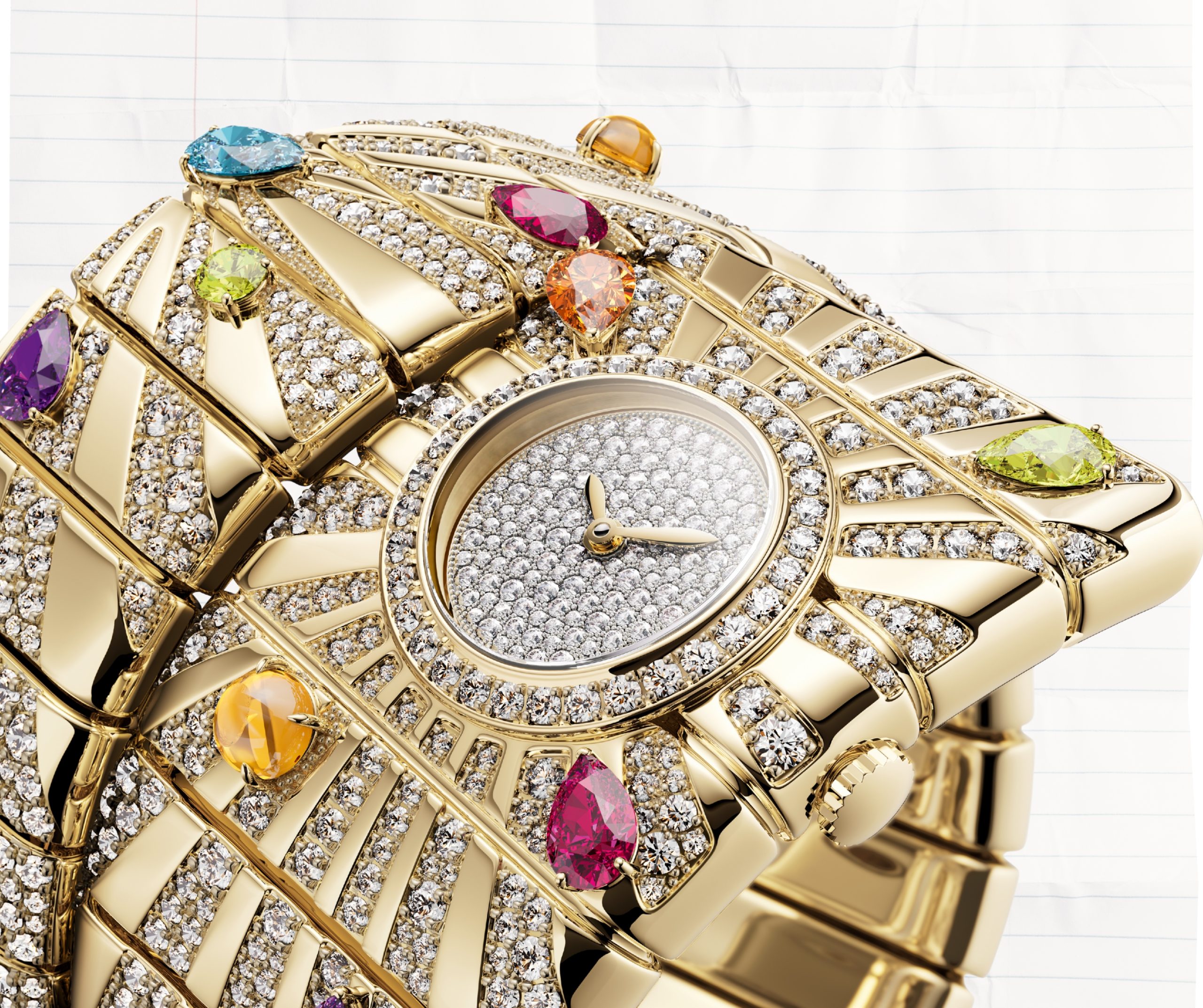 La reinterpretación actual introduce un trabajo cromático deliberado. Diamantes y gemas de color —citrinos, rubelitas, peridotos, amatistas, topacios y espesartitas— se distribuyen a lo largo del brazalete, creando una superficie vibrante pero controlada. El resultado no es exuberancia gratuita, sino una lectura sofisticada del color como elemento estructural, muy en sintonía con el lenguaje joyero romano de Bvlgari.