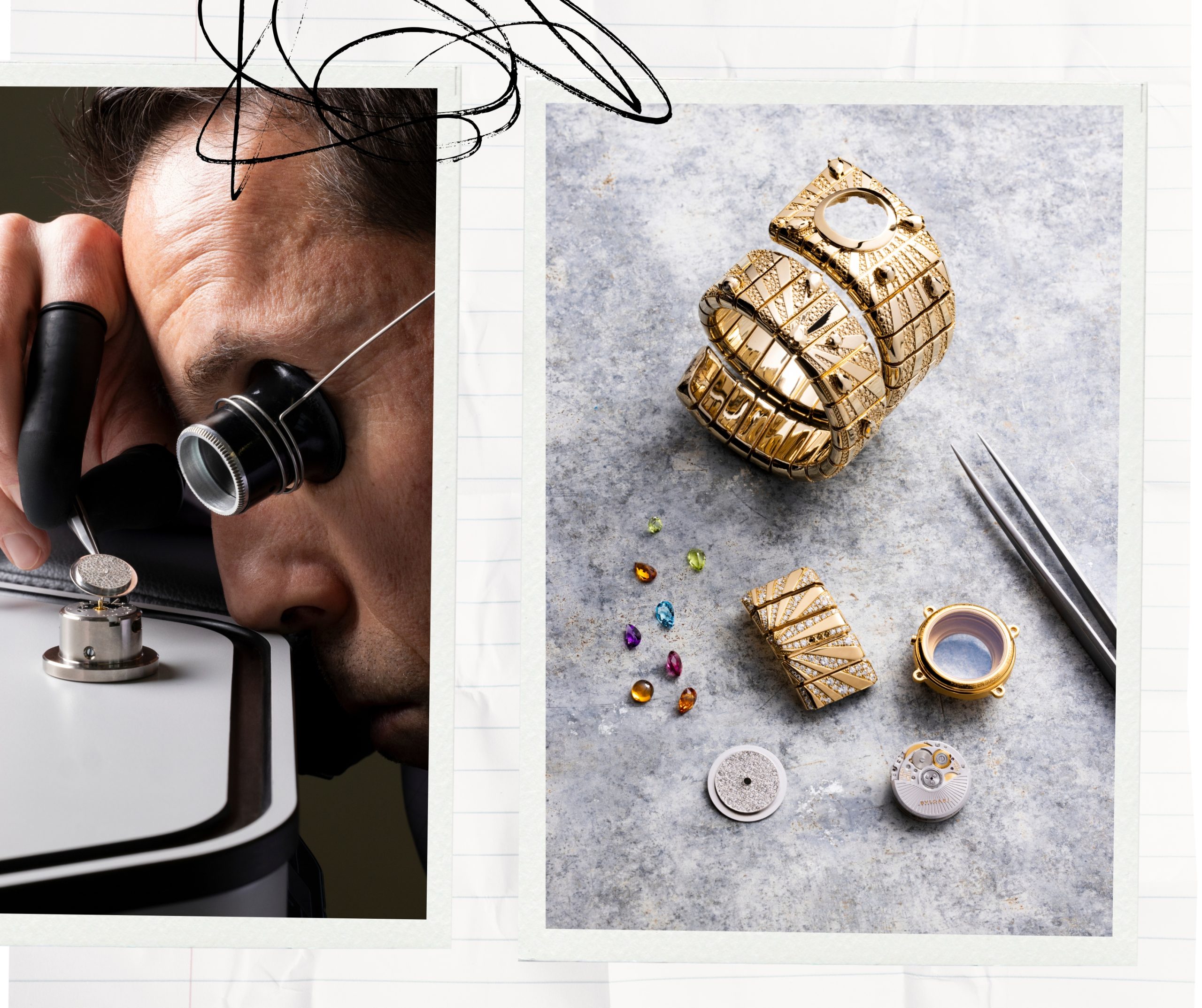 Tubogas apareció por primera vez en Bvlgari a inicios de los años cuarenta, inicialmente con formas serpentinas, y se consolidó en los setenta como uno de los códigos más reconocibles de la marca. El Tubogas Manchette recupera ese legado desde la arquitectura, con una esfera cuadrada integrada en un amplio brazalete de oro amarillo, que mantiene la flexibilidad característica del motivo Tubogas.