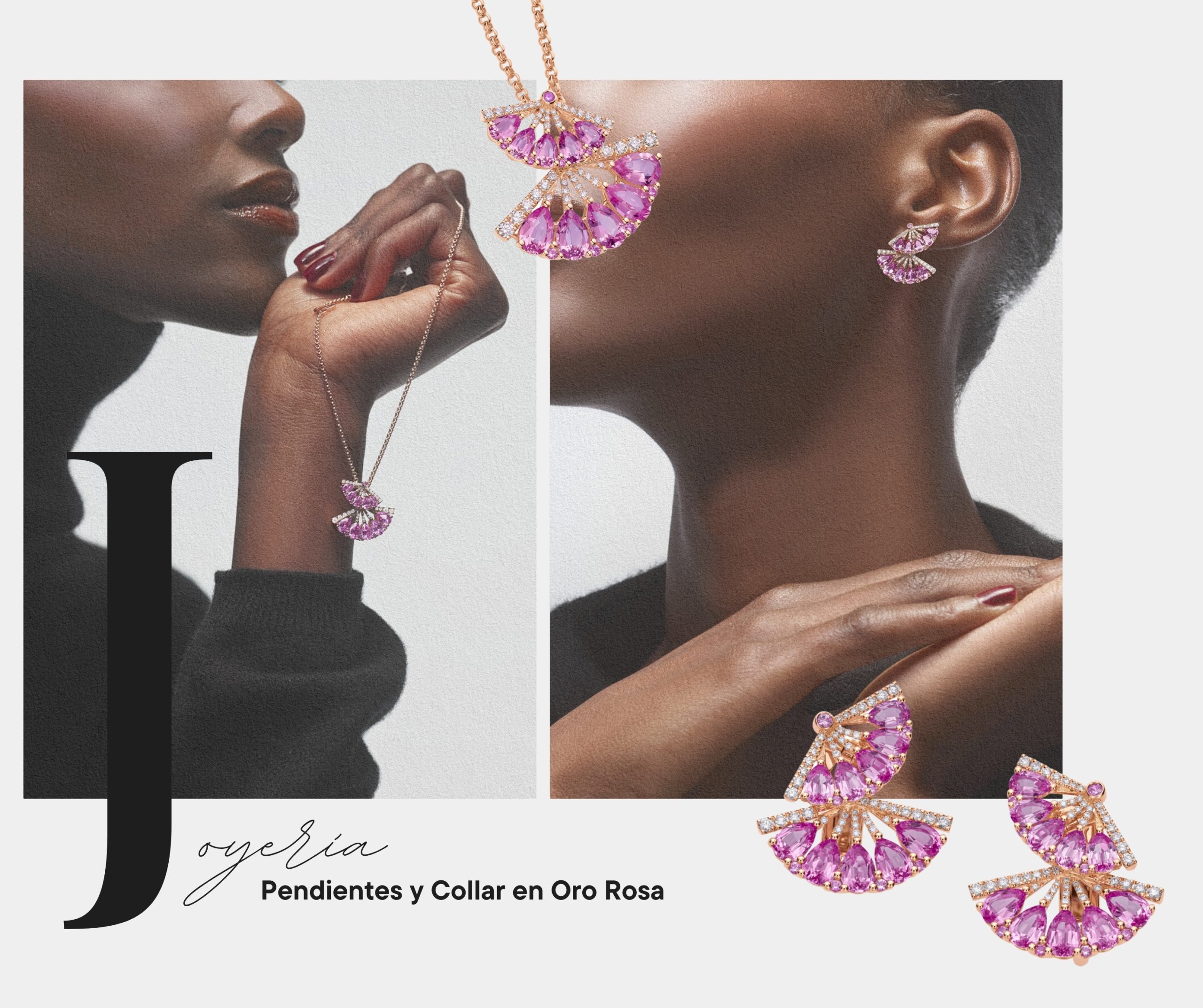 Los nuevos pendientes y el collar están hechos en oro rosa de 18 quilates y llevan zafiros rosas y diamantes. El diseño se inspira en un tutú clásico de ballet. Las piedras están colocadas en capas, una sobre otra, creando volumen y dando la sensación de movimiento, como si la pieza estuviera girando. Los zafiros rosas aportan un color suave y delicado, mientras que los diamantes añaden brillo y contraste. El resultado es una joya que acompaña el movimiento natural del cuerpo y refleja la luz de distintos ángulos.