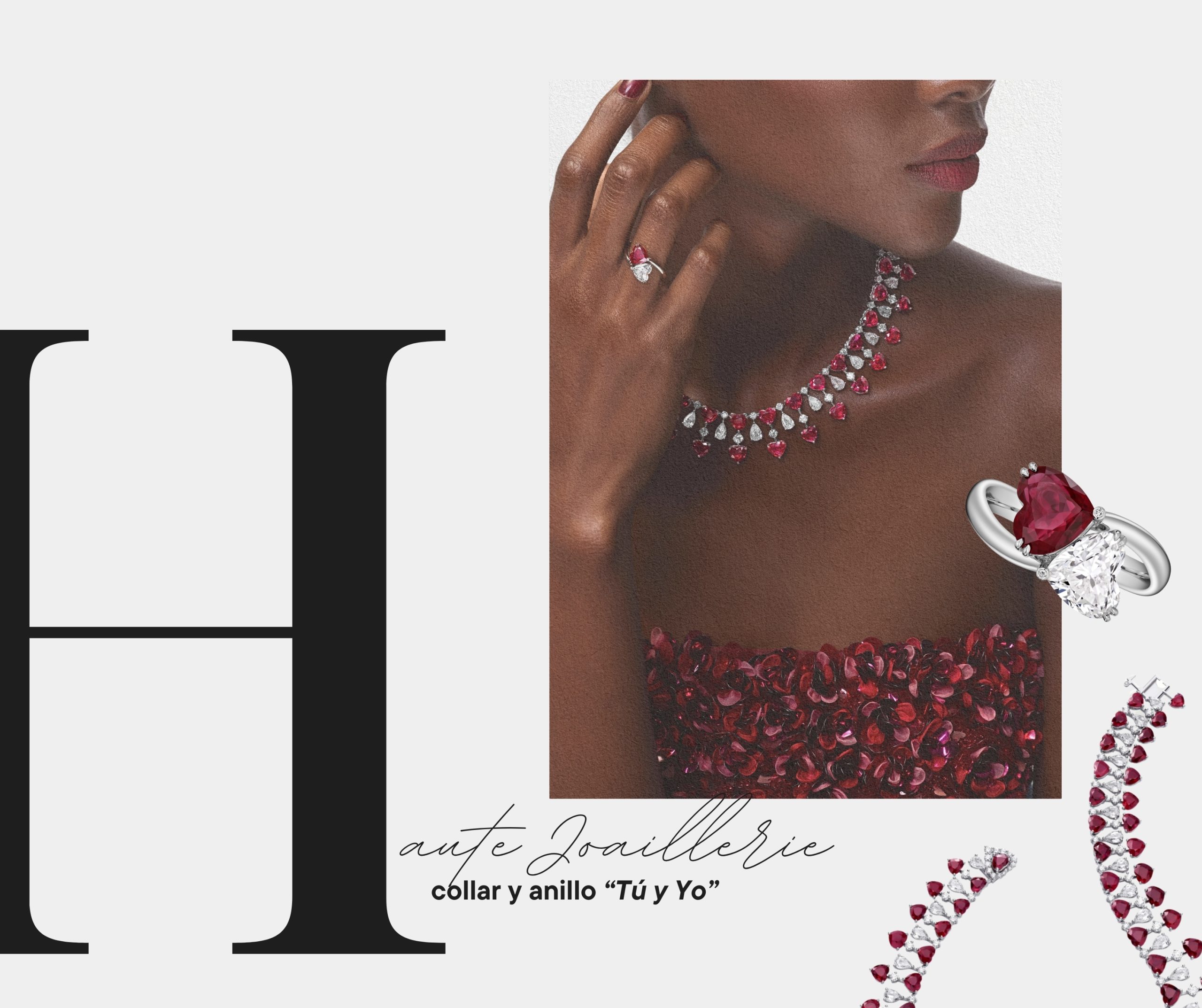 La colección también incluye piezas de alta joyería, donde el color y el simbolismo toman protagonismo. Destaca un collar compuesto por 64 rubíes en forma de corazón combinados con diamantes. Un diseño lineal y visualmente impactante. A juego está el anillo “Tú y Yo”, que une un rubí y un diamante, ambos en forma de corazón, como símbolo de unión. El rubí aporta una energía más intensa y emocional. Su color rojo, tradicionalmente asociado con la pasión y la fuerza, añade profundidad al universo de L’Heure du Diamant.