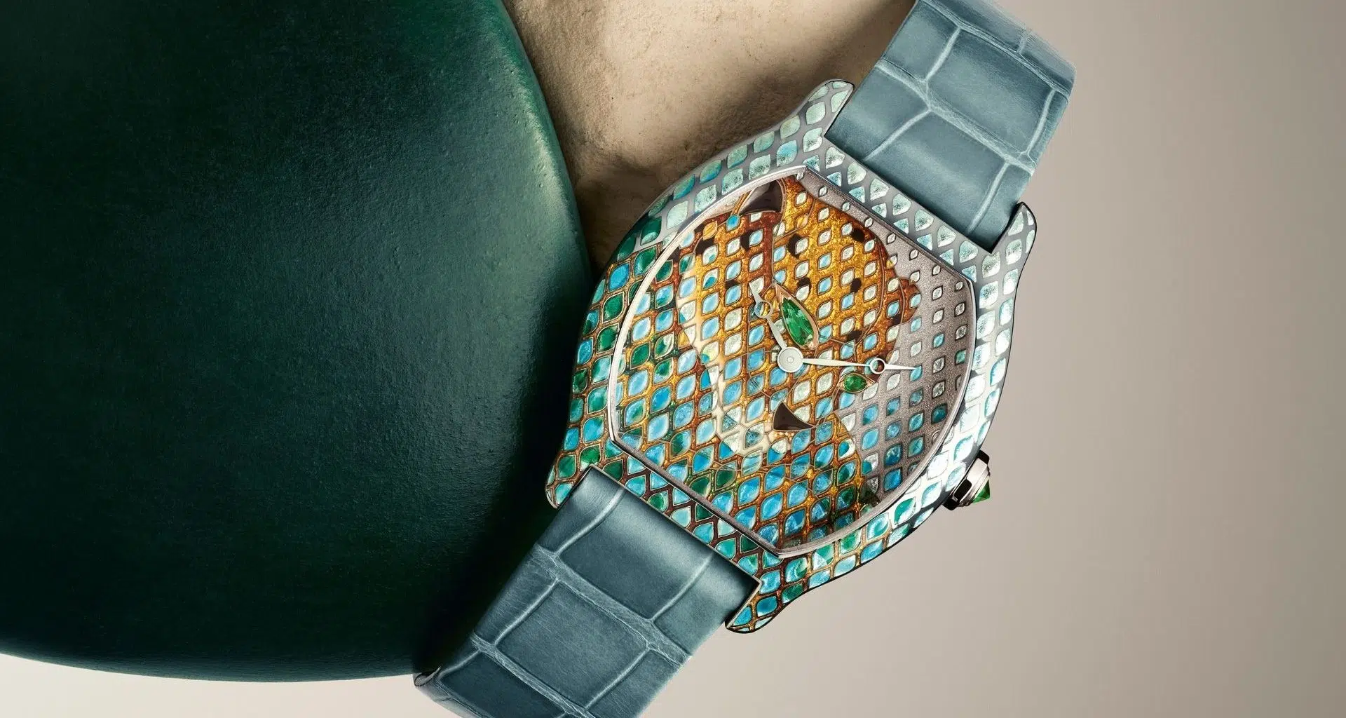 El diseño inspirado en una tortuga vuelve con nuevas versiones y un Tortue Panthère Métiers d’Art donde el felino aparece tras una cortina de lluvia esmaltada.