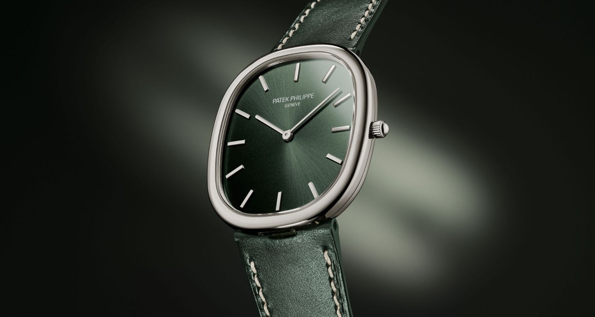 El Patek Philippe Golden Ellipse regresa en tamaño mediano con carátula verde oliva. Es uno de los relojes más finos de la colección actual: 5.9 mm.