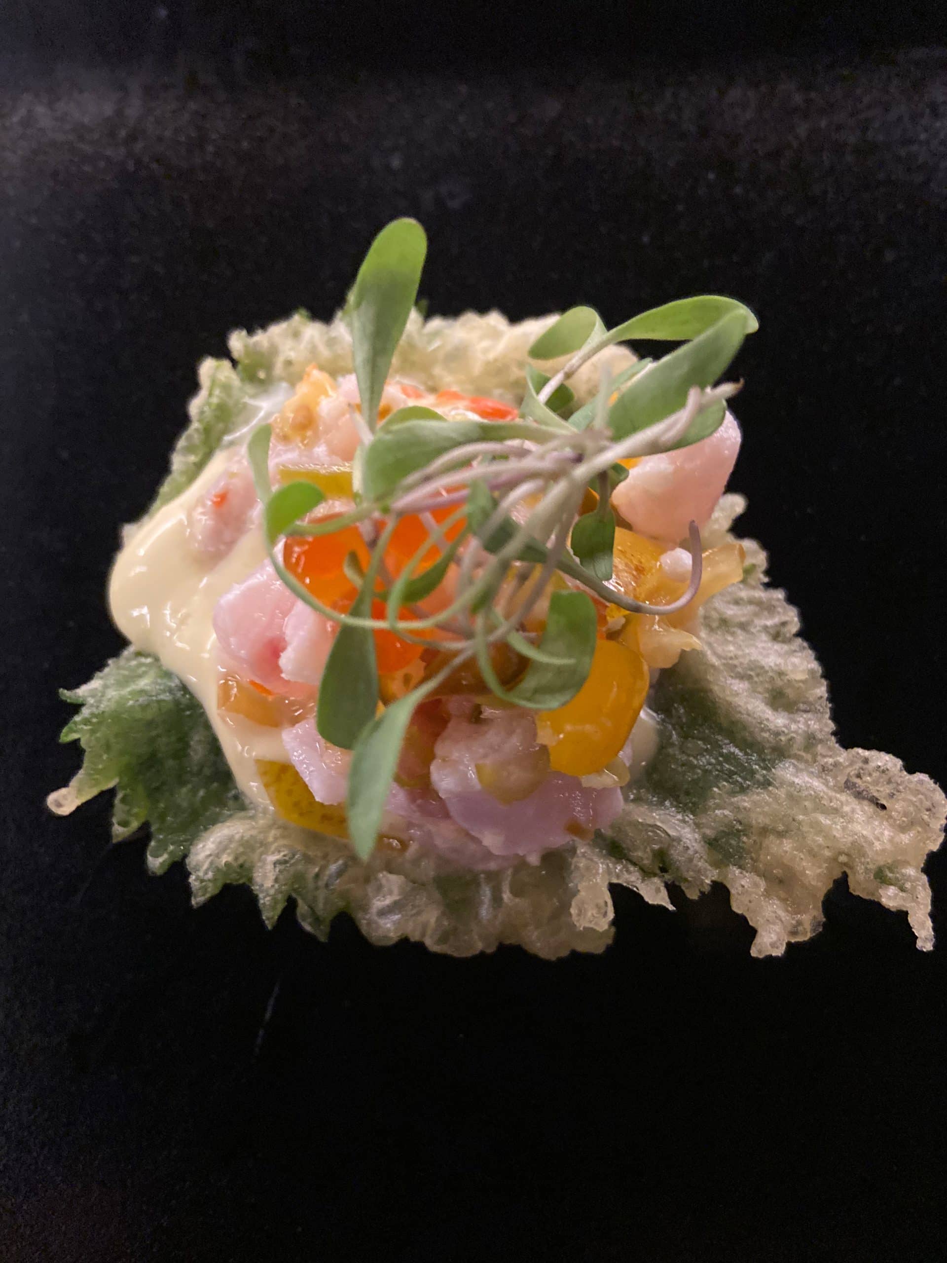 La propuesta toca el cielo con la tostada de hoja de shiso tempurizada con robalo y salsa de shishito y yuzu. En este caso la tempura es ligera, el shiso aporta frescor herbal y el robalo —sutil y exacto— se beneficia del contraste cítrico del yuzu.