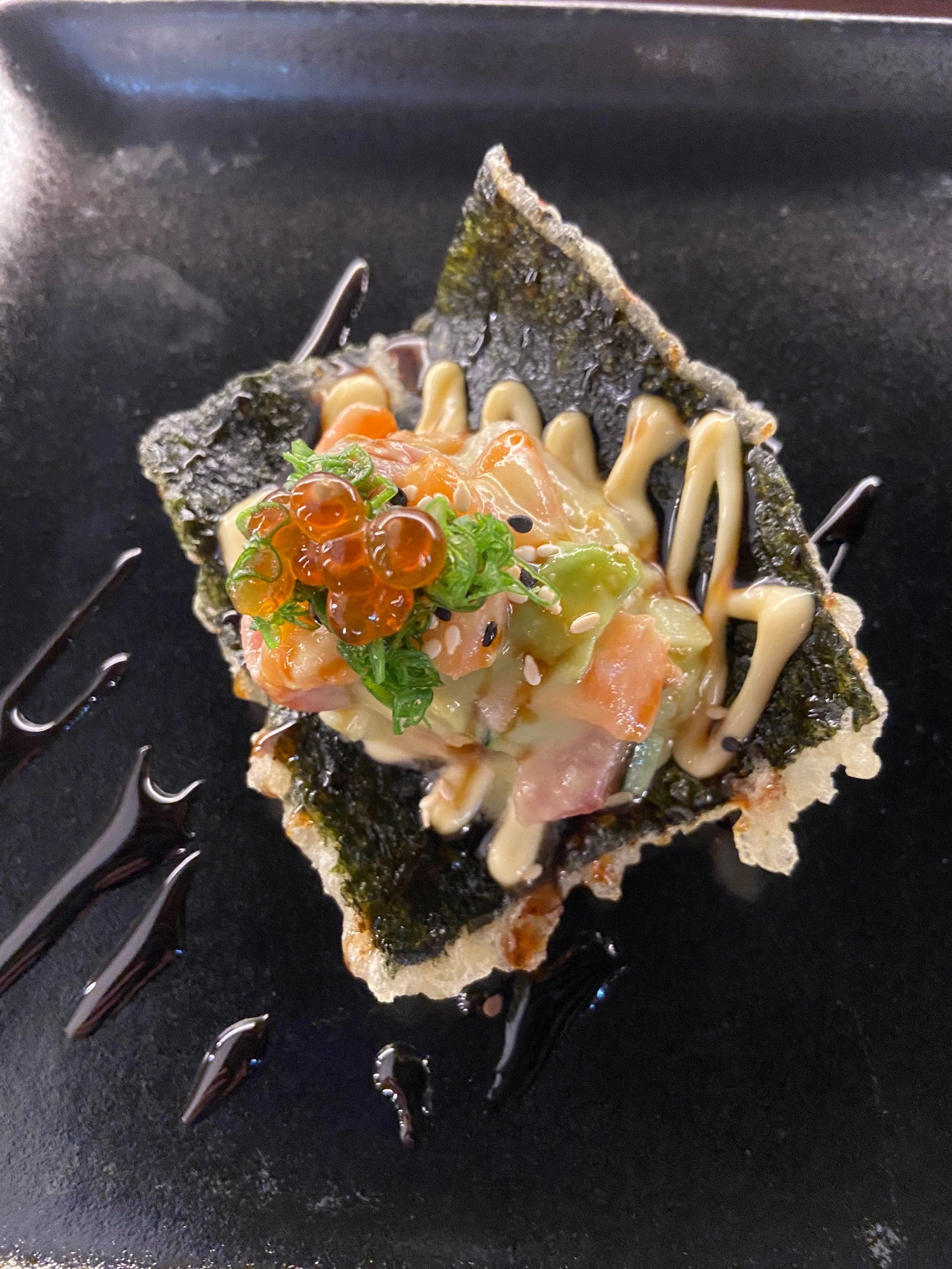 El viaje sigue con una de las especialidades de la casa, las tostadas kaisen, con mix de proteína, jalapeño, serrano, aguacate, cebollín e ikura.