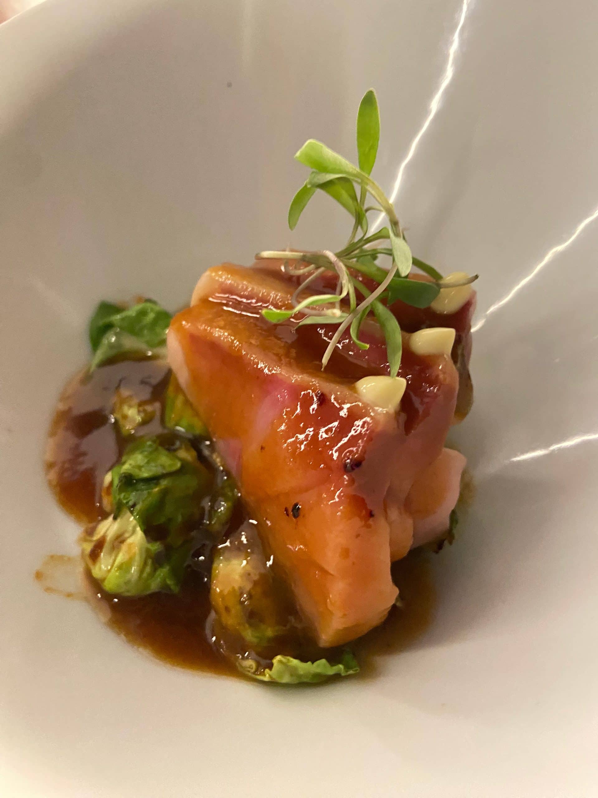 Entre los platillos del recorrido de omasake una ensalada con atún karaage que funciona como un despertar gustativo: el contraste entre fritura ligera y frescura vegetal es delicioso. También un sashimi de hamachi con coles de Bruselas salteadas en miso dulce, un plato donde destaca el equilibrio: el hamachi llega con corte limpio y textura firme, mientras que las coles aportan caramelización y profundidad sin dominar al pescado.