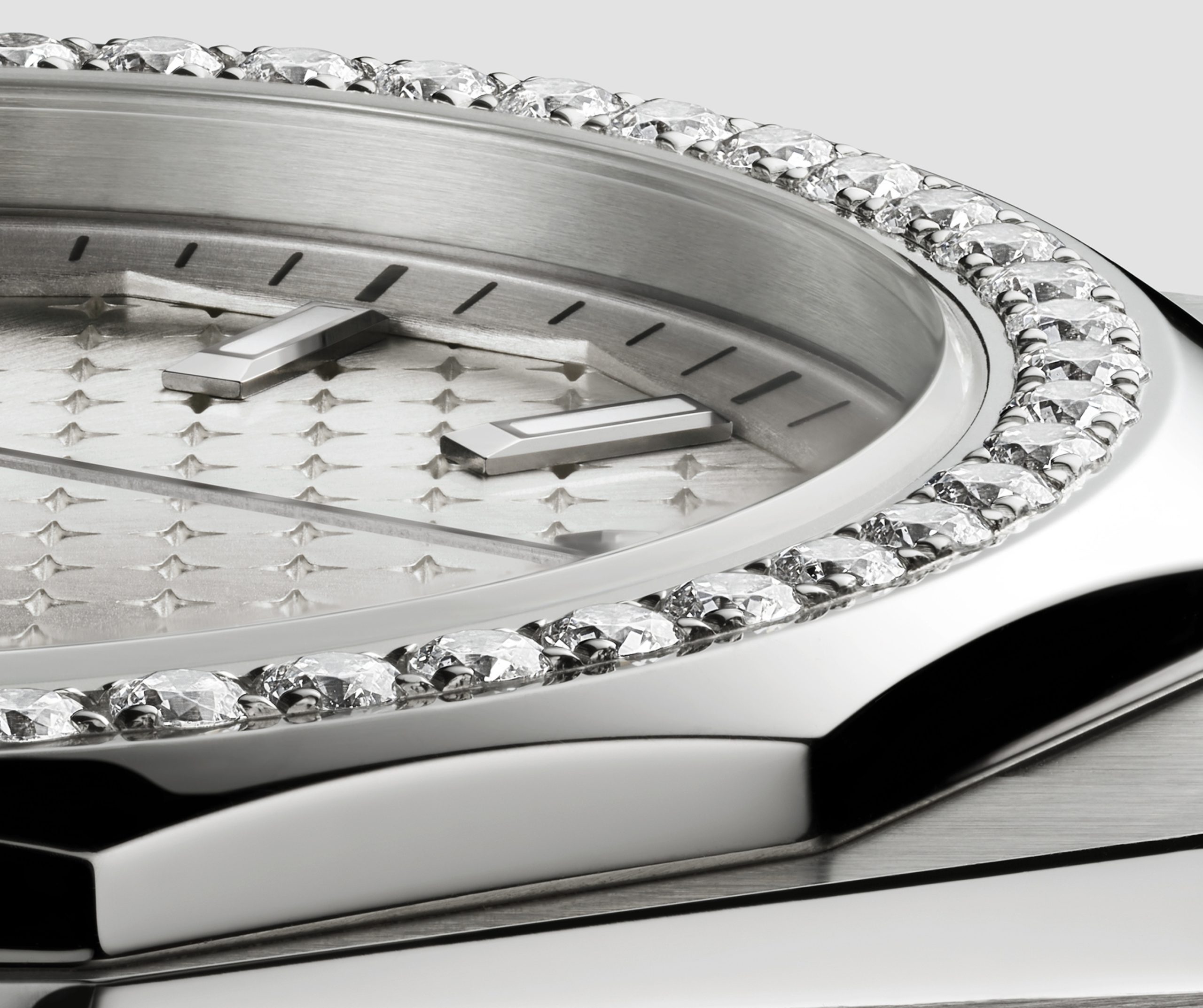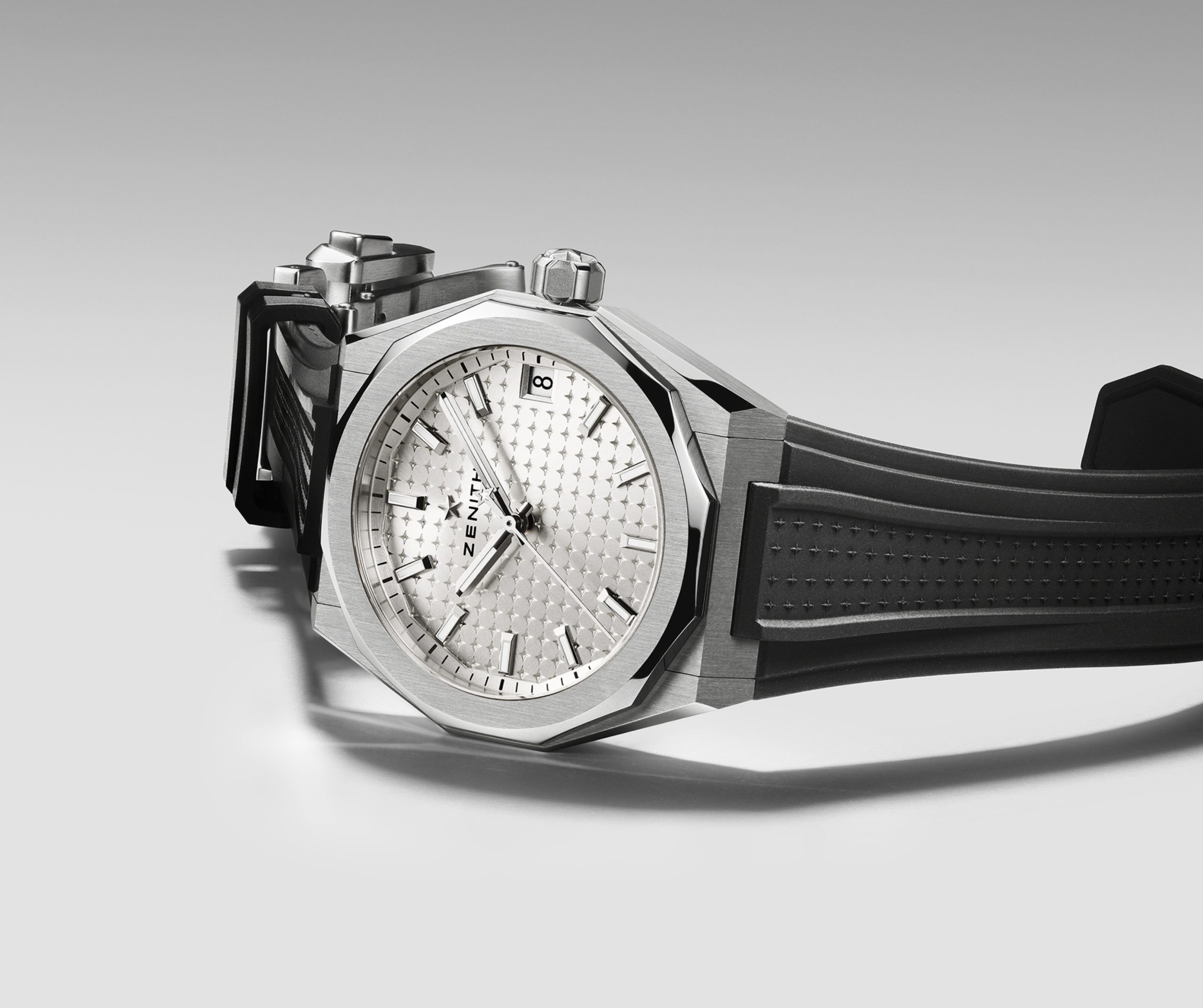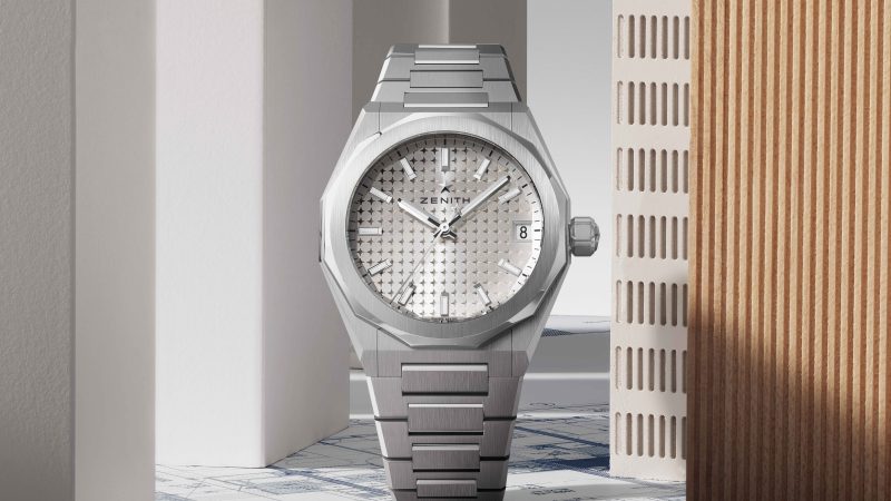 En esta escala, el reloj mantiene todas las claves de la colección: caja facetada de acero con bisel dodecagonal, líneas tensas que recuerdan a los DEFY de finales de los 1960 y una estética que lo hace ideal para oufits casuales. La carátula, con acabado rayos de sol en tono plata, está decorada con el motivo geométrico de estrella de cuatro puntas, una reinterpretación del histórico logotipo “doble Z” de Zenith. El resultado es un juego de reflejos muy sutil que cambia según la luz, lo que recuerda a los edificios de las grandes ciudades.