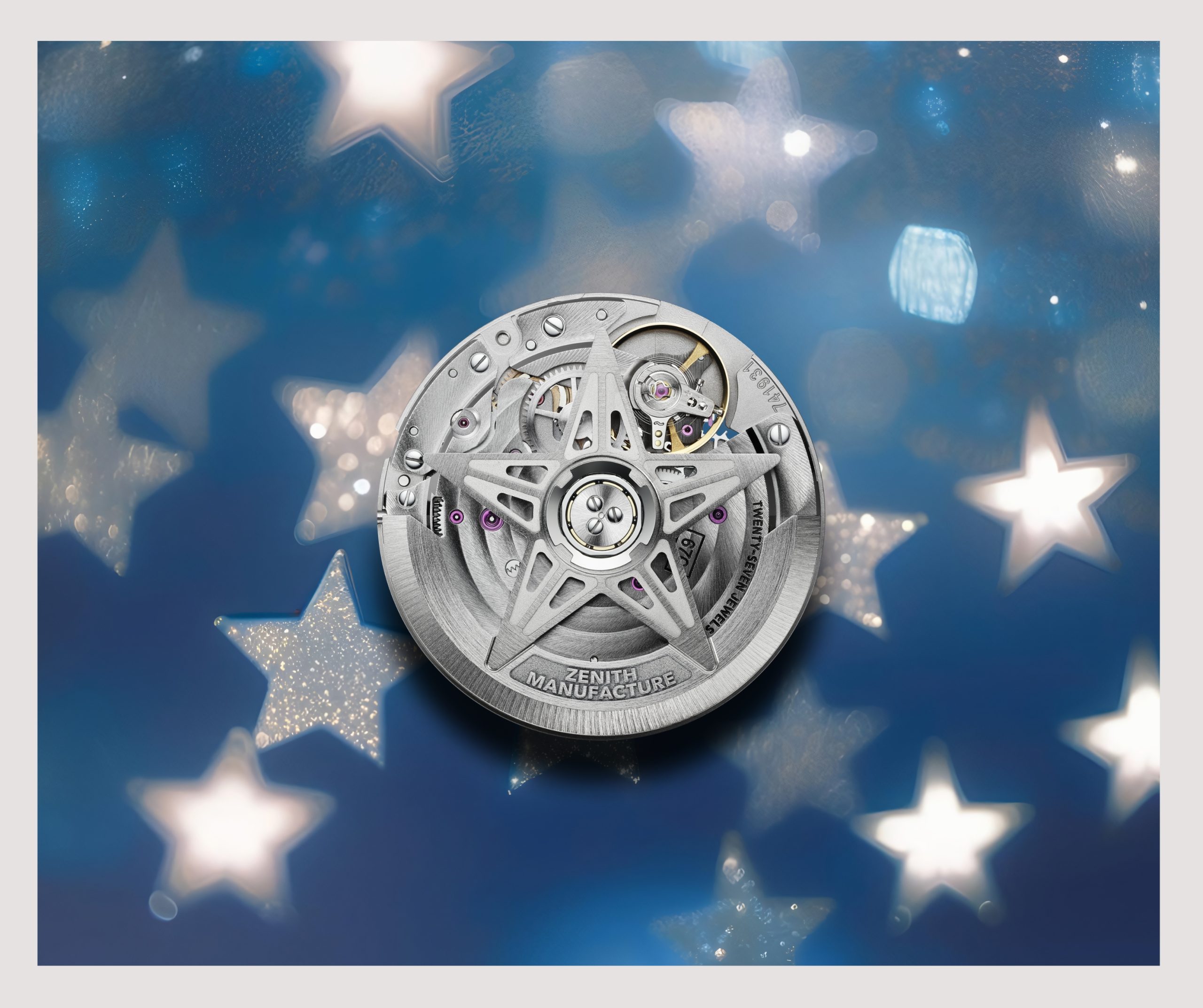 Debajo de la arquitectura limpia de su carátula, trabaja el calibre automático Elite 670, manufactura Zenith. Late a 4 Hz, ofrece 50 horas de reserva de marcha y se deja ver a través del fondo de zafiro, donde destaca la masa oscilante calada en forma de estrella. Y, como es un movimiento pensado para el uso diario, ofrece lo esencial: indicación central de horas, minutos y segundos, fecha a las 3 h.